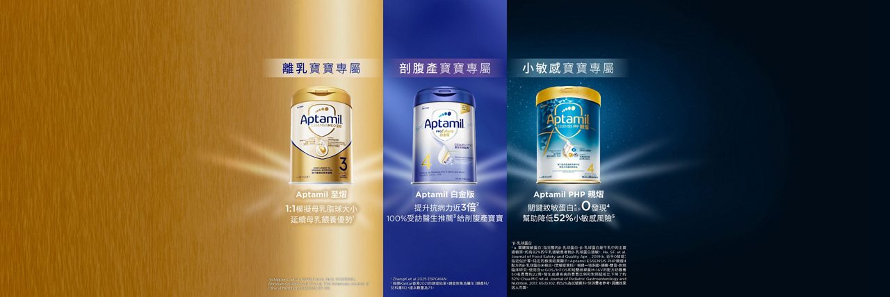 3. a. 關鍵致敏蛋白:指完整的β-乳球蛋白。β-乳球蛋白是牛乳中的主要過敏原,約有82%的牛乳過敏患者對β-乳球蛋白過敏。β-乳球蛋白是檢測食品中是否含有牛奶蛋白的關鍵標誌物。b. 近乎0發現:指近似於零。Aptamil ESSENSIS PHP親熠4配方為100%乳清蛋白部分水解配方設計。特定的檢測結果顯示,Aptamil ESSENSIS PHP親熠4配方的β-乳球蛋白未檢出。(實驗室資料)