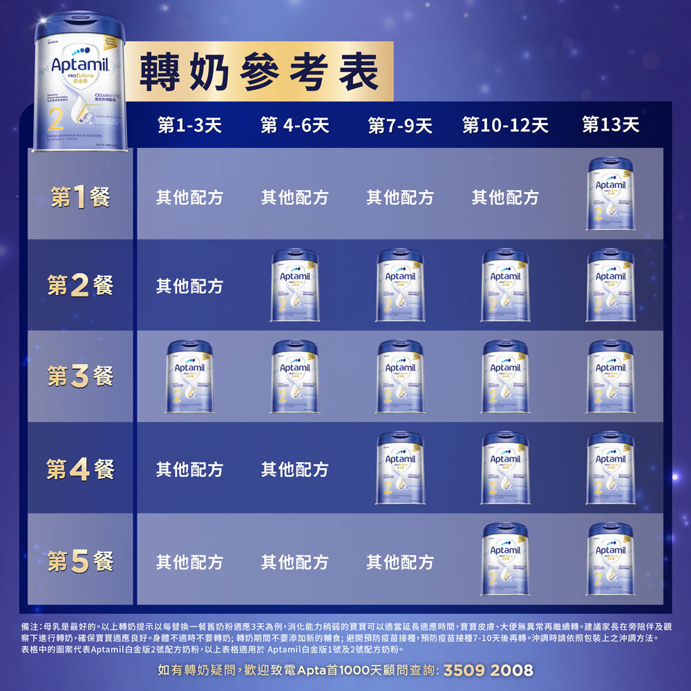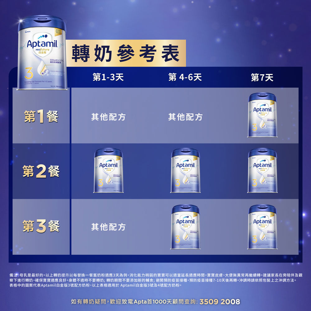 備注:母乳是最好的。以上轉奶提示以每替換一餐舊奶粉適應3天為例,消化能力稍弱的寶寶可以適當延長適應時間,寶寶皮膚、大便無異常再繼續轉。建議家長在旁陪伴及觀察下進行轉奶,確保寶寶適應良好。身體不適(有病)時不要轉奶; 轉奶期間不要添加新的輔食; 避開預防接種,預防接種7-10天後再轉。沖調時請依照包裝上之沖調方法。表格中的圖案代表Aptamil 白金版3號配方奶粉,以上表格適用於 Aptamil 白金版3號及4號配方奶粉。如有轉奶疑問,歡迎致電Apta首1000天顧問查詢: 3509 2008