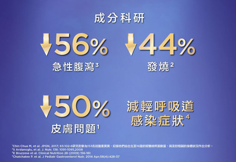 其他數據顯示,成分有效減少皮膚問題¹、發燒²、急性腹瀉³ 及減輕呼吸道感染症狀⁴。