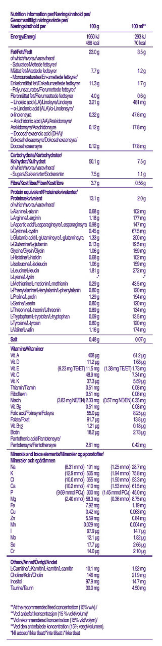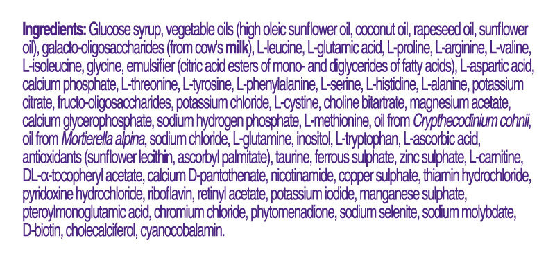 特別氨基酸配方粉,不含賴氨酸,低色氨酸, 含必需和非必需氨基酸、碳水化合物、脂肪、維他命、礦物質和微量元素及膳食纖維 。