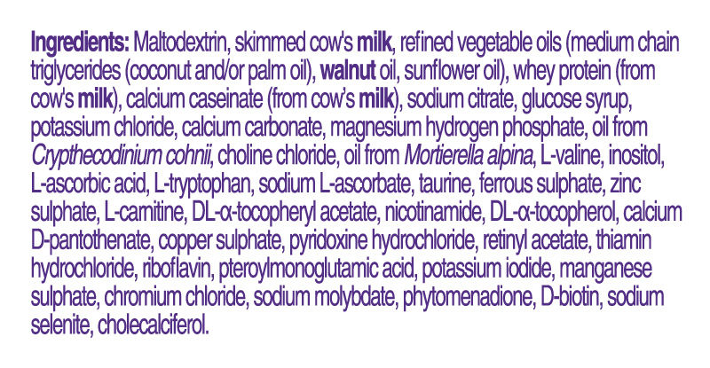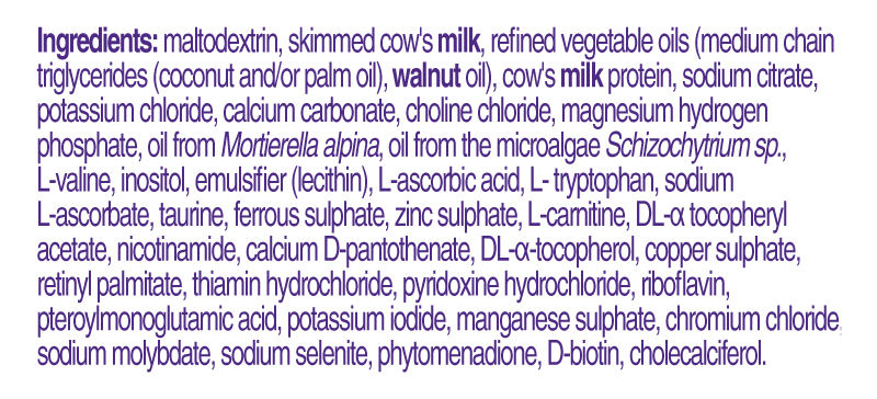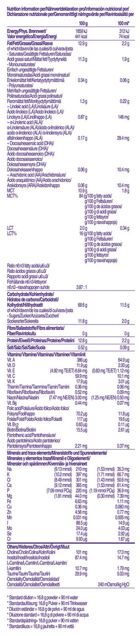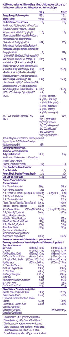 可以作全營養的配方粉。低脂肪,含有蛋白質,低量長鏈三酸甘油酯(LCT)和高量中鏈三酸甘油酯(MCT)。